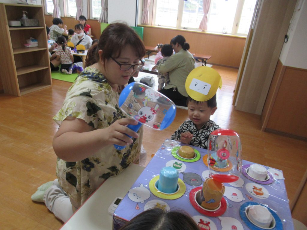 今年の1.2歳さんは、忍者遊びやおばけごっこを楽しんでいたので、忍者のお面をつけて、忍者になりきってお祭りを楽しみました♪