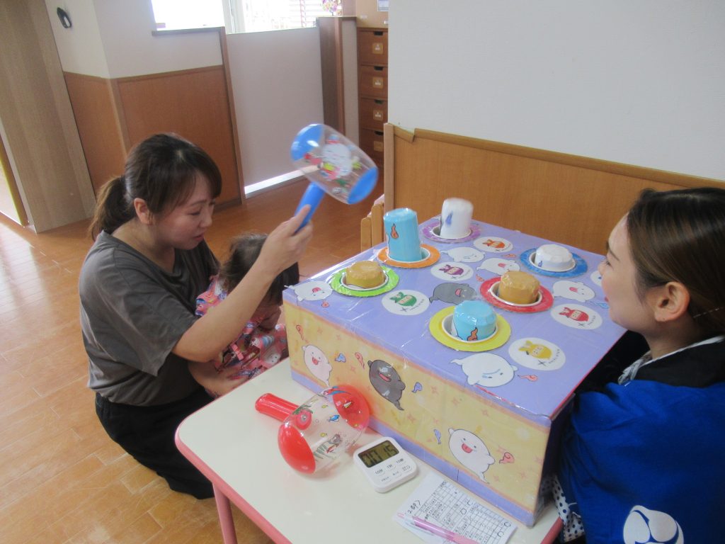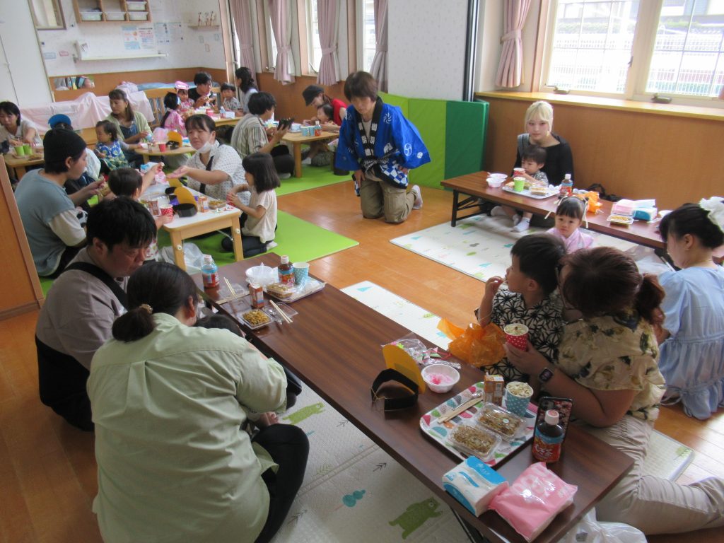 室内では、忍者になりきって「ポン!」と出てくるおばけを叩いて遊んだり、食育で登場したかき氷・やきそば・ポップコーンをお家の方を一緒に味わったりして楽しい時間を過ごしました🎵