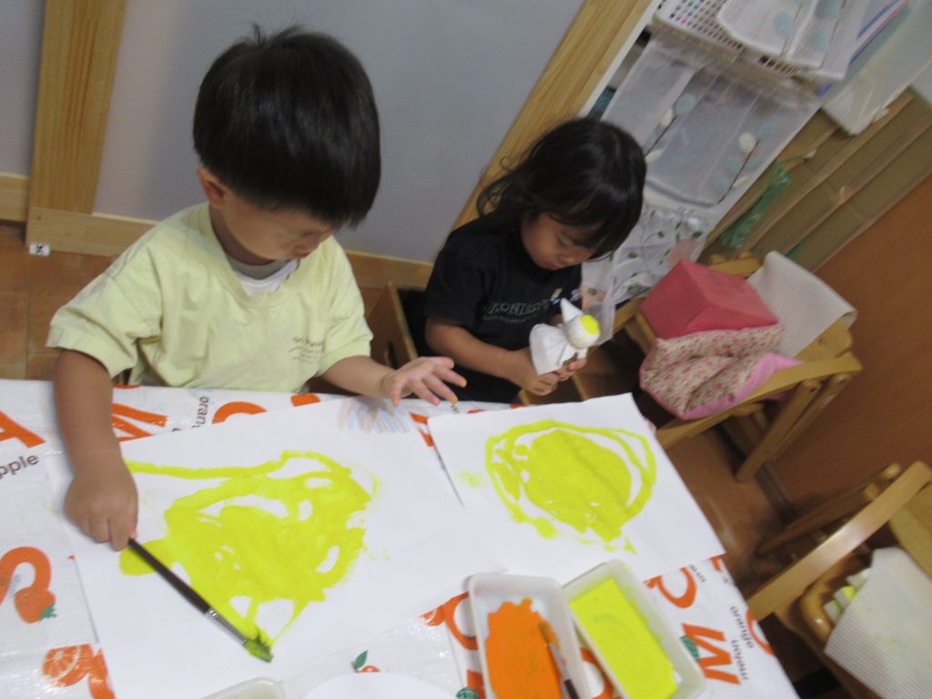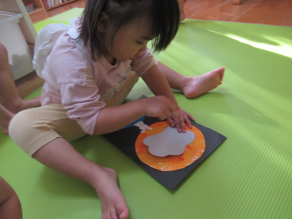 自分だけのお月さまを画用紙いっぱいにのびのび描いたり、「お月さまこんばんは」のお話のように雲でお月様をかくしたりしながらお話の世界を楽しみました🎵