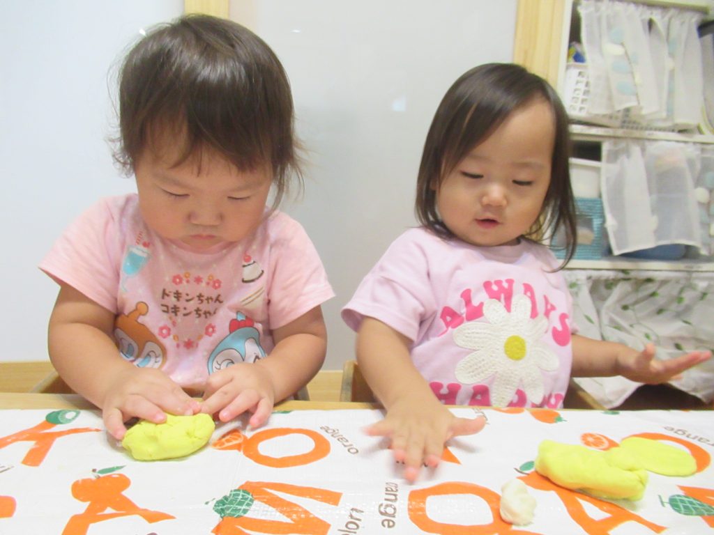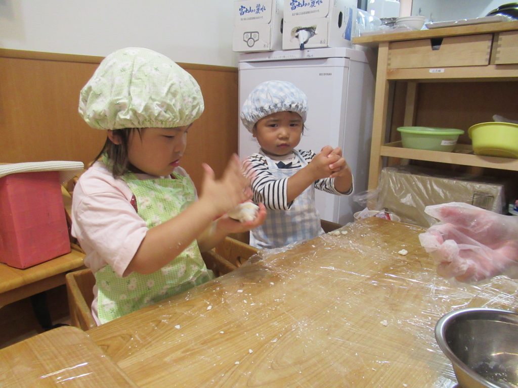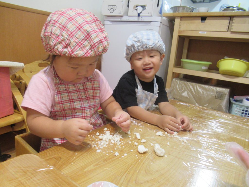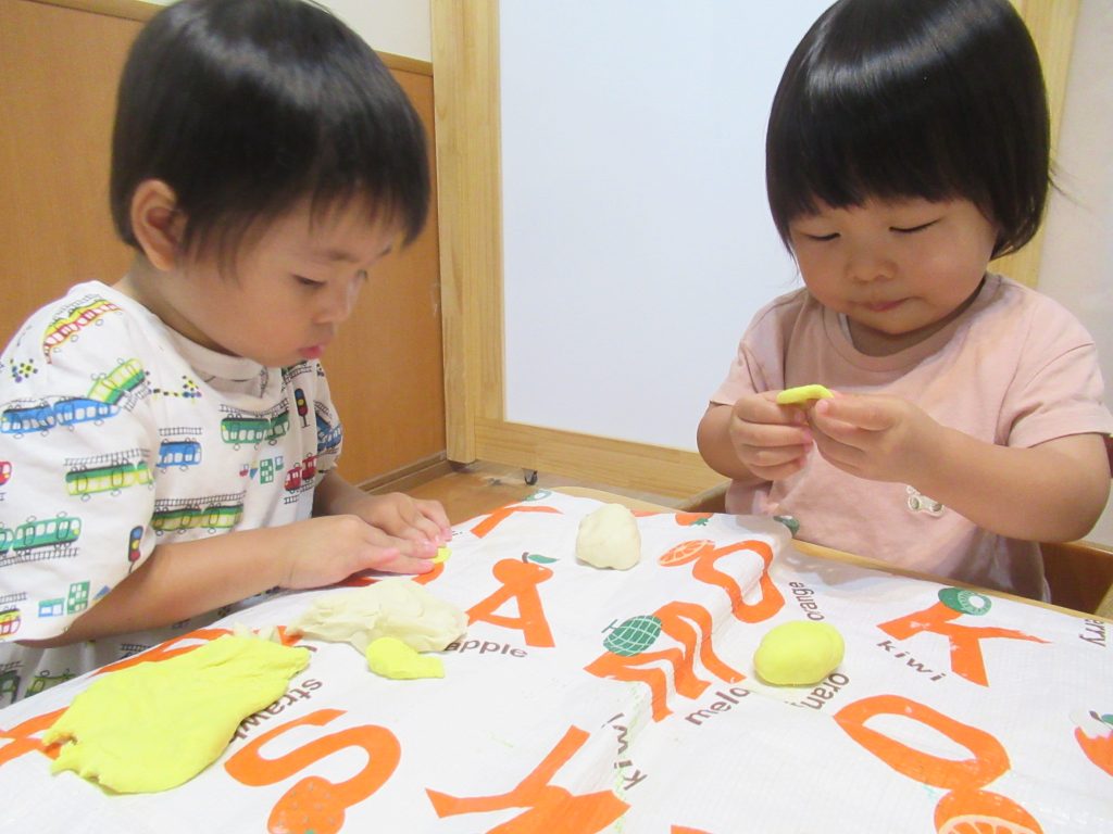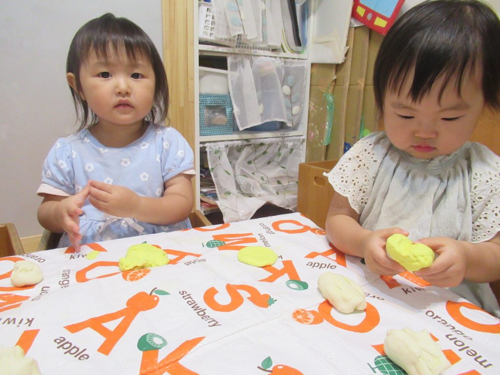 小麦粉粘土遊びでは、お月見だんごやお月様を作って楽しみました。